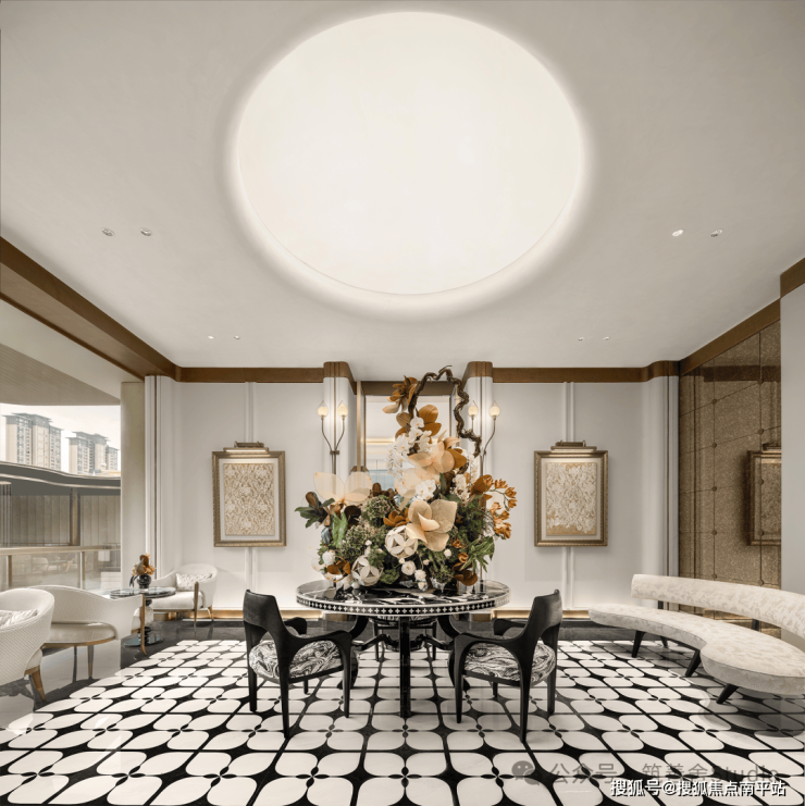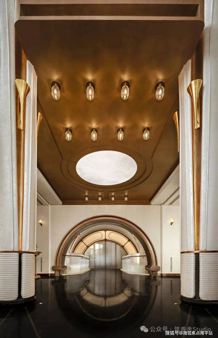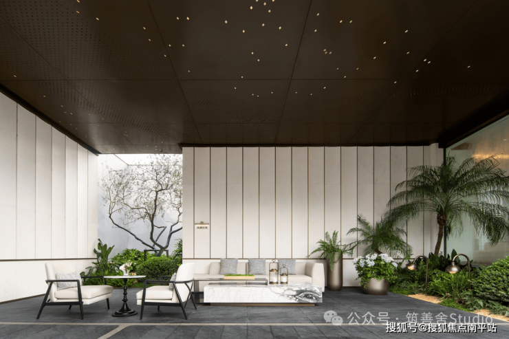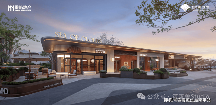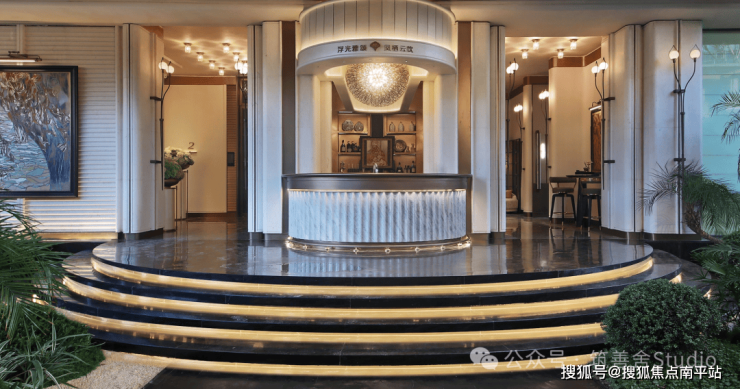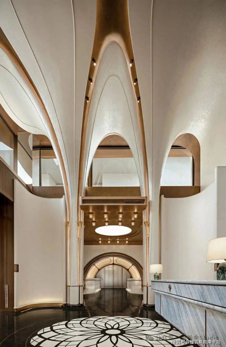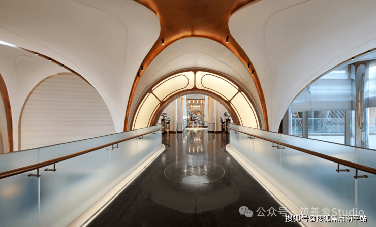 小区大门入口处一条优雅的曲线巧妙延伸,它不仅是建筑的起始点,更是将建筑、社区入口与地下车库入口三者和谐统一的纽带。设计灵感源自凤凰花,屋檐巧妙运用香槟金铝板勾勒轮廓,立面则以大理石铺陈,整体尺寸为67米长、7.5米高,展现出优雅与精致。它生动诠释了“凤凰木——自然生长”的理念。正对入口的造型宛如一朵绽放的凤凰花,顶部的穿孔板则模拟凤凰羽毛的形态,呈放射状展开,将凤凰木的自然之美淋漓尽致地展现出来。
