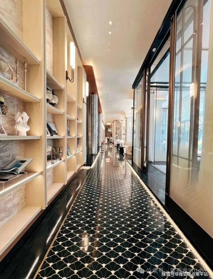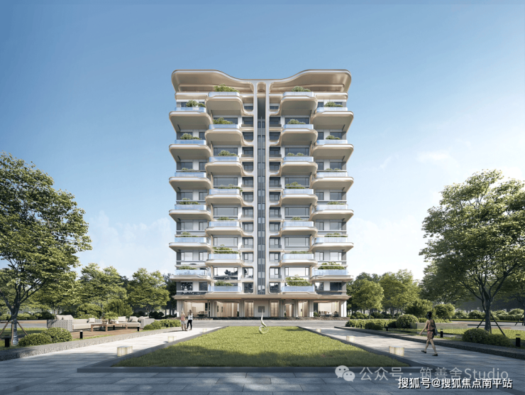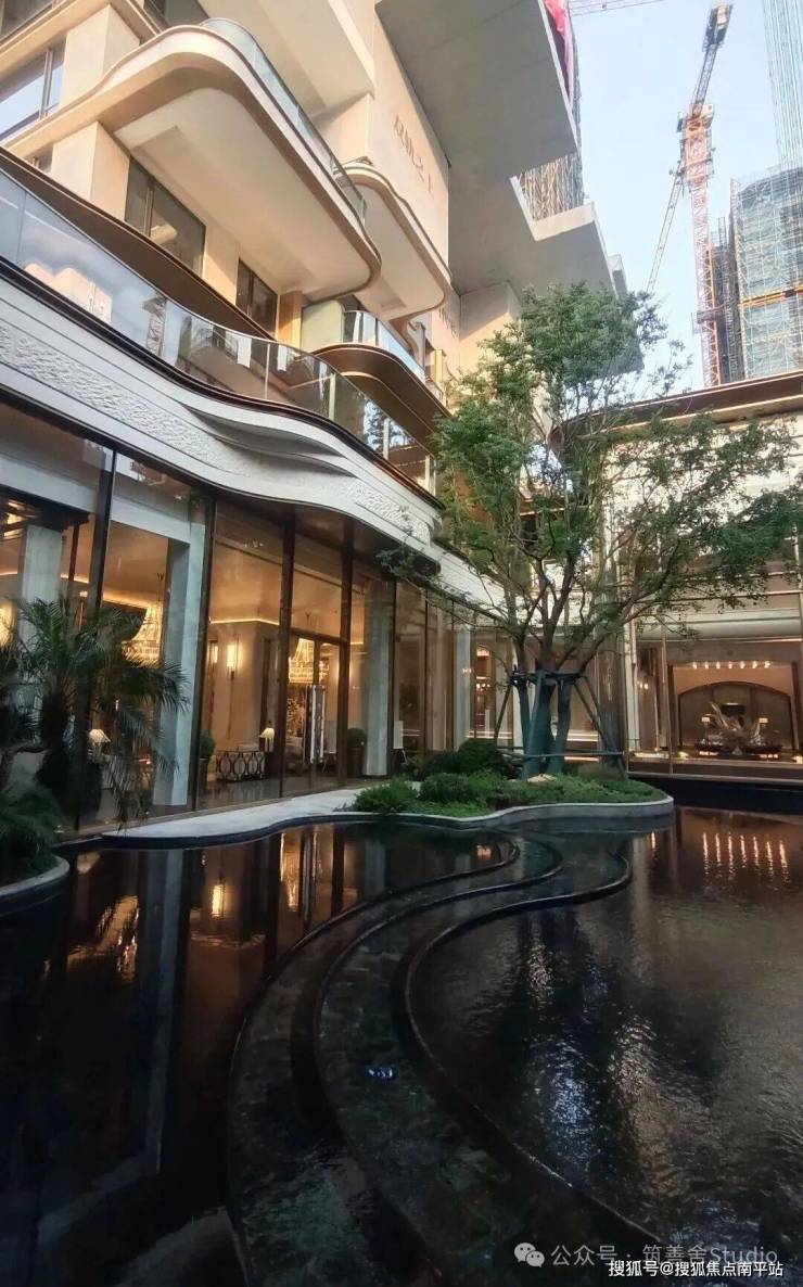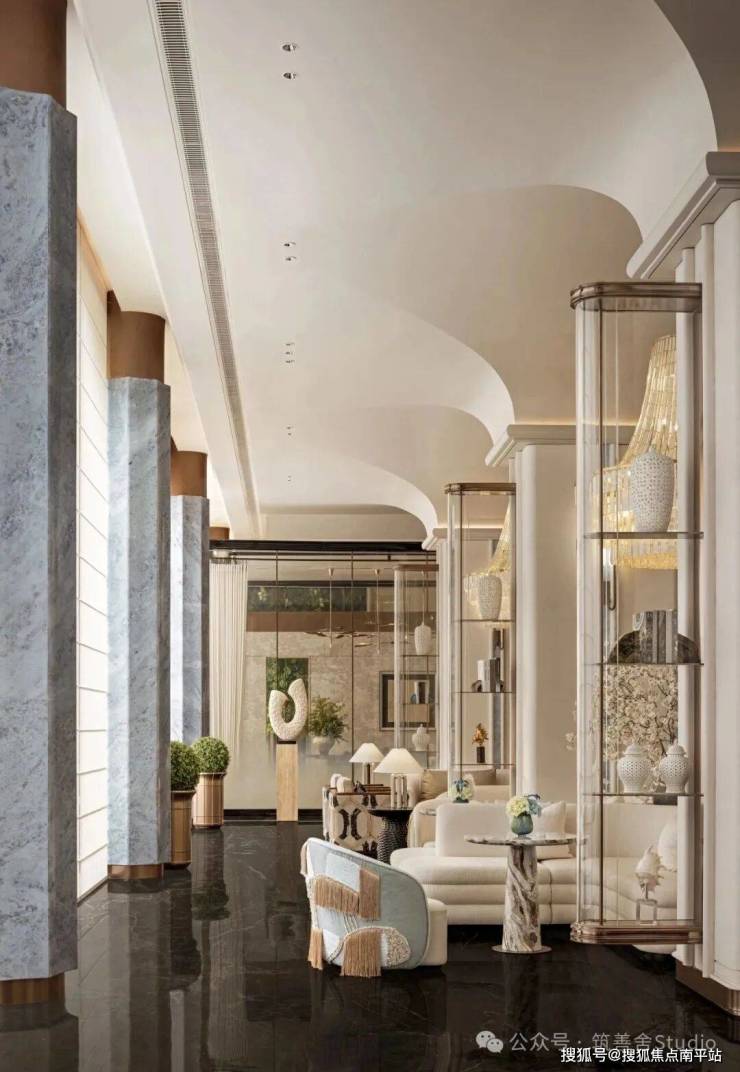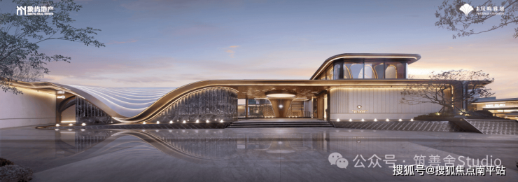 外立面采用米黄色与深色大理石、香槟色铝板及通透玻璃幕墙的精致组合,呈现超流体全面屏设计,搭配270°环幕视野飘窗,尽显现代美学与开阔视野。