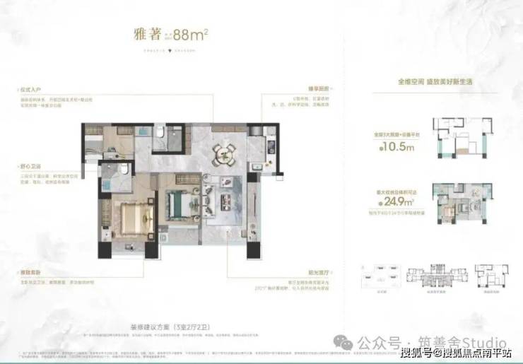 约88㎡全明三房两卫,超越市面100㎡户型,综合使用率高达83%。约11.6米南向五开间,270度全景采光设计,打造大客厅的舒适视野。全屋配备三大飘窗、设备平台及壁橱,额外赠送约8㎡空间,最大收纳总体积可达24.9m³,满足您的一切收纳需求。