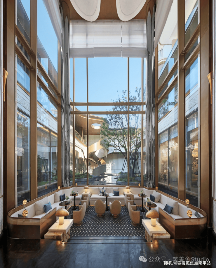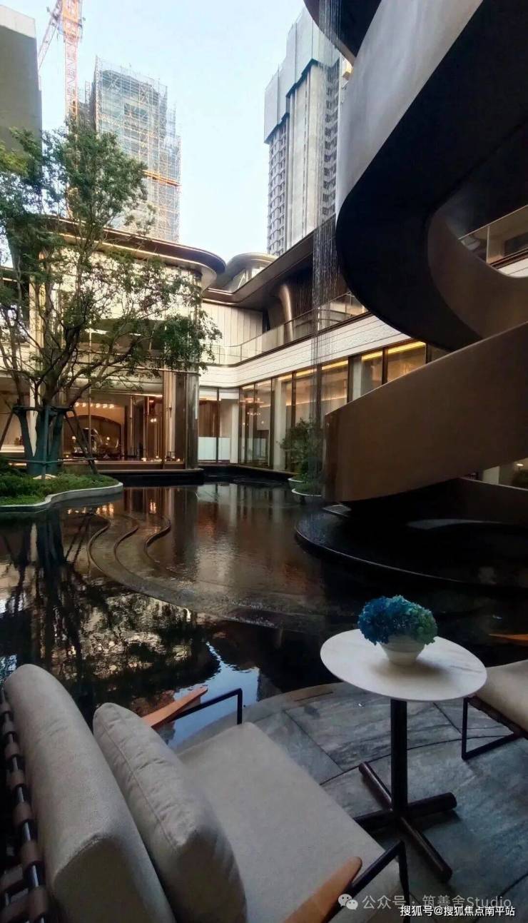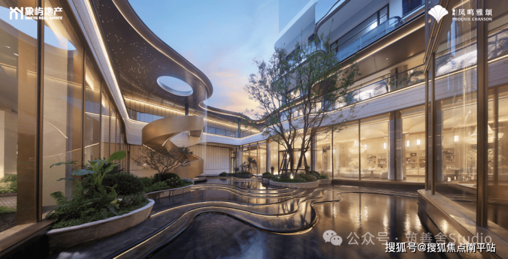 于下沉庭院中悠然徜徉,在时光的流转里,静待目光的温柔交汇,汲取丰盈的精神与坚韧的内在,与内心的愉悦与松弛产生共鸣。水光潋滟,星光璀璨,光影交织间,旋转楼梯伴随着流水与雨滴,优雅地垂落而下。
