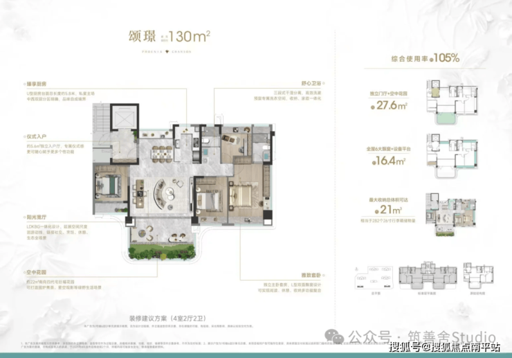 130㎡四房两卫,实际享受165㎡独门独户大平层!户户边套,综合使用率高达105%。南向面宽约15.3米,配备【入户门厅 挑高6米大露台】和双花园设计,全屋6大飘窗,赠送约16.4㎡设备平台。最大收纳空间达38.6m³,LDKBG一体化设计打造近66㎡墅级大方厅,尽享无限生活场景。