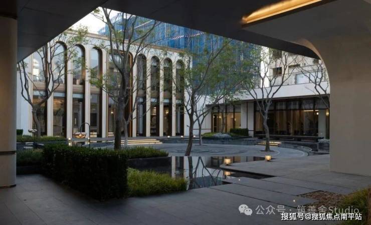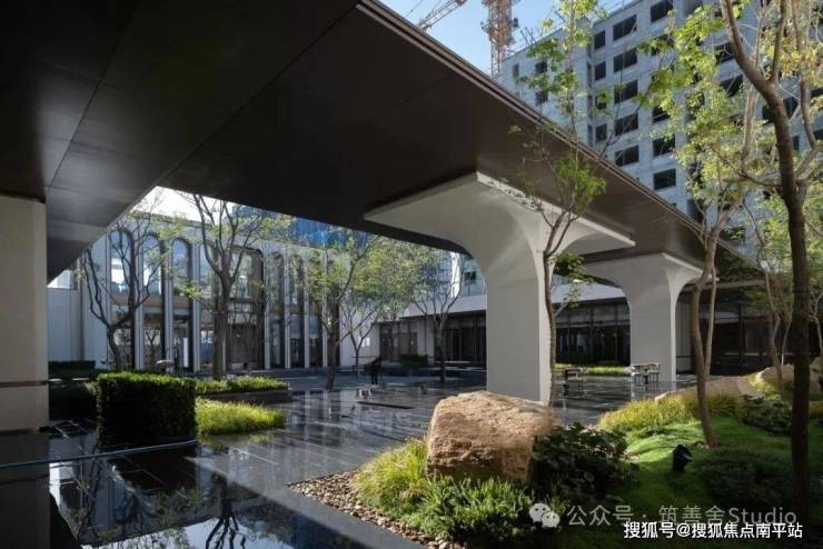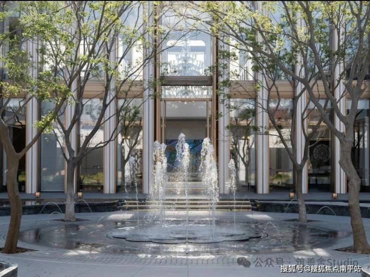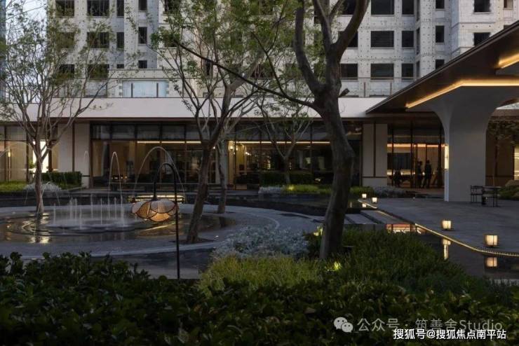 融合四颗精选朴树,旱喷广场打造出中心聚合的舒适空间,营造出轻松愉悦的生活烟火气息。