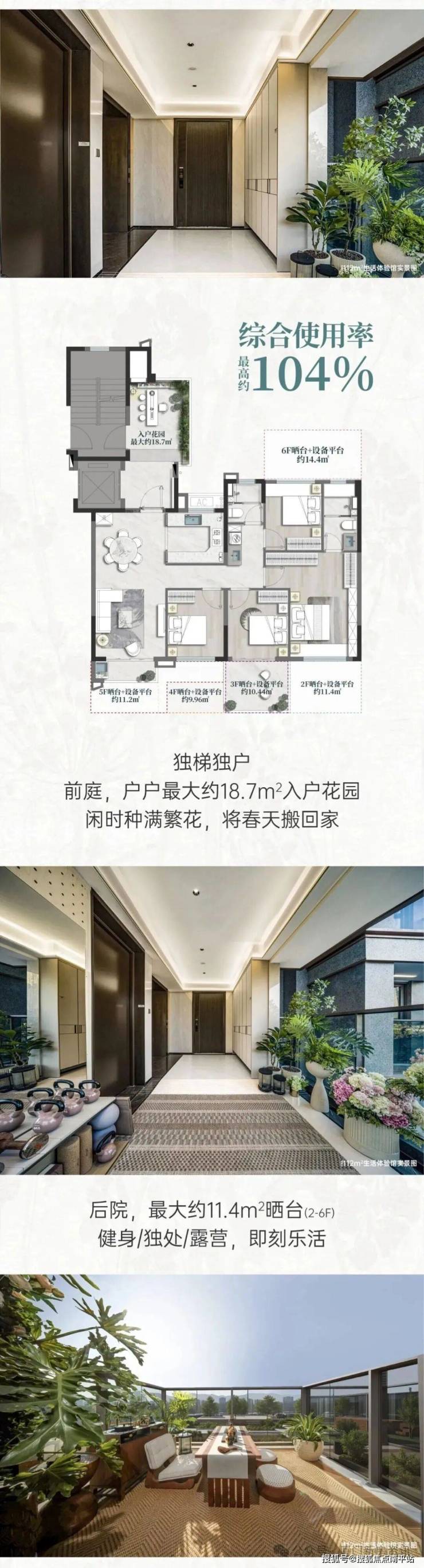 现加推 2#洋房、5#高层。 洋房一梯两户设计,配备酒店式双开门电梯,实现独梯入户。综合使用率最高104%,户户 最大约18.7㎡入户花园,后院, 最大约11.4㎡晒台(2-6F),健身/独处/露营,即刻乐活。