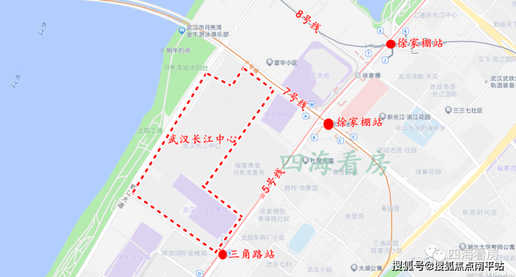 地铁与公交:项目地块比较大,北面地块最靠近徐家棚站,徐家棚站是地铁5号线、7号线、8号线的换乘站,该站比较大,可以连接汉口CBD、三阳路、南湖、后湖、武汉天地、徐东等各个板块。