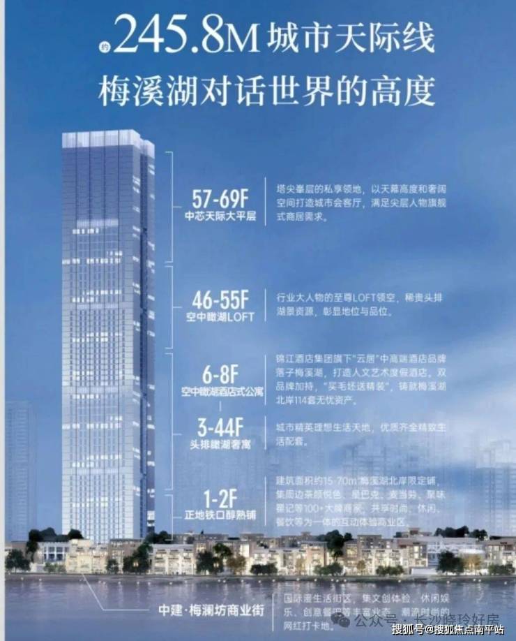 约245.8米高的摩天大楼,梅溪湖北岸最高标志性建筑。楼体采用全玻璃幕墙结构,铸就奢阔景观视野。结合精奢平层、百变LOFT、顶级大平层等多业态发展,引领区域经济红利。