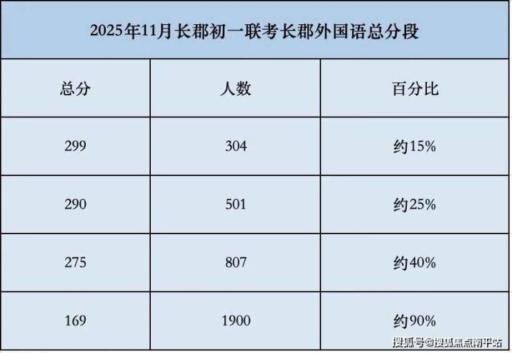 2025年11月份长郡系初一联考,郡外本部与南校区合并统计。前15%分数段,郡外略微强于长郡双语;前40%分数段,两者大体相当,长郡双语微有优势。