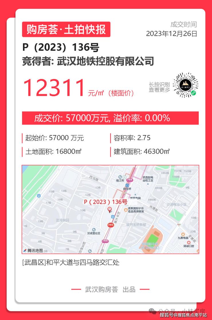这一地块是武汉地铁集团在2023年12月的土拍中拿下的,成交总价5.7亿,成交楼面价12311元/平。