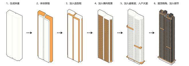 体量生成:建筑强化体量咬合关系,非对称形体切割且倒角处理,以微弧的波浪元素呼应长江文化。
