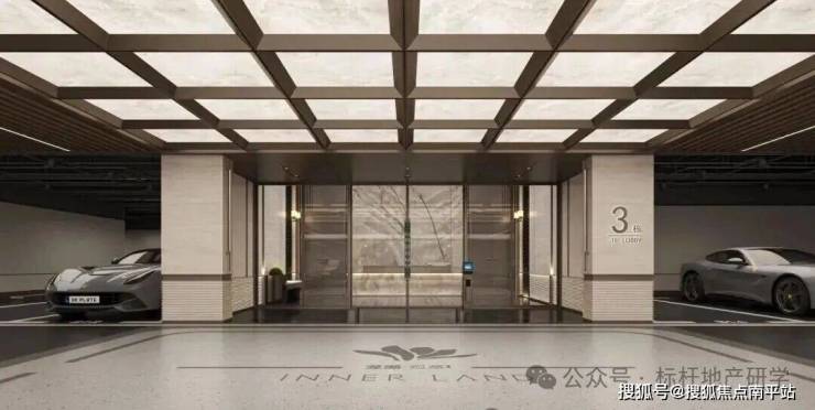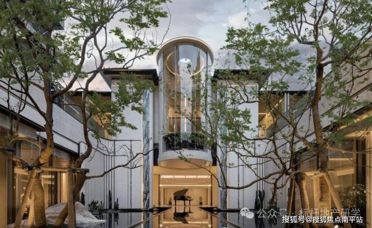 主入口以69米超尺度城市界面展开,融合7米高柱式挑檐,复刻奢华酒店落客环岛设计,营造仪式感的归家序章。归家路特选10米高丛生铁冬青“树王”作为迎归象征,结合三重奢石景墙与静谧镜面水景,构筑出充满领域感的城市界面。树木与水景相互映衬,天光与倒影交织成震撼视觉,在神性与光影的渗透中,形成引人入胜的精神场域,强化了归途中的仪式感与体验深度。围绕下沉庭院配备台球室、健身房、棋牌室、高尔夫、练歌房、私宴厅等功能,形成一体化的配套共享空间。