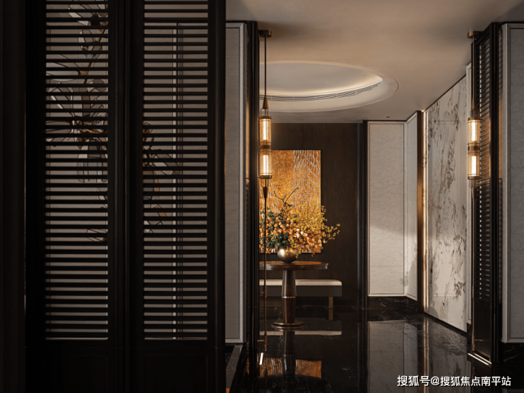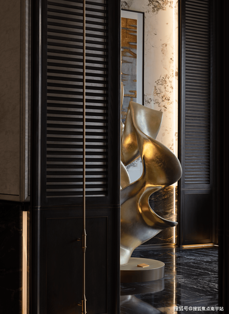 空间转入过厅,这里是一隅“美的停顿”。雕塑以海浪与剪纸意象重构韵律,在现代材质与手工感之间找到平衡。当人在此慢下脚步,空间真正完成一次自然呼吸,让前后情绪得到缓冲。