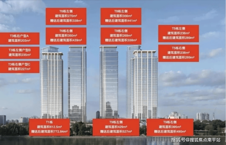 产品分布如下:1#,35层高,只有一个面积段,约630㎡户型;3#,50层高,约205-236㎡户型;5#,50层高,约236-240㎡户型;6#,49层高,约270-350㎡户型;8#,49层高,约270-350㎡户型;9#,37层高,约377-405㎡户型。1#和9#承担最大面积,所以一线头排望江;6#和8#面积段其次,因此位置稍微靠后,但也能做到垂直望江;1#和5#是200+平专场,视线就需要避让头排,斜出江景。