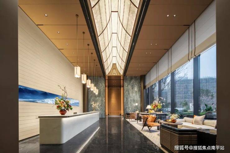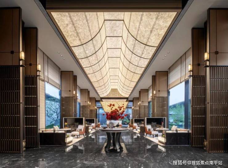 大门主入口引入“把酒店搬回家”的产品理念和“回家即度假”的生活理念,打造奢华酒店式归家大门。屋顶高约9.7米,整体挑檐向两侧延伸,长约49米,庑殿金顶的屋顶形态,以现代化的设计手法融入传统屋顶形式,结合鲁班锁倒影装置传达山水倒影的意境生活。