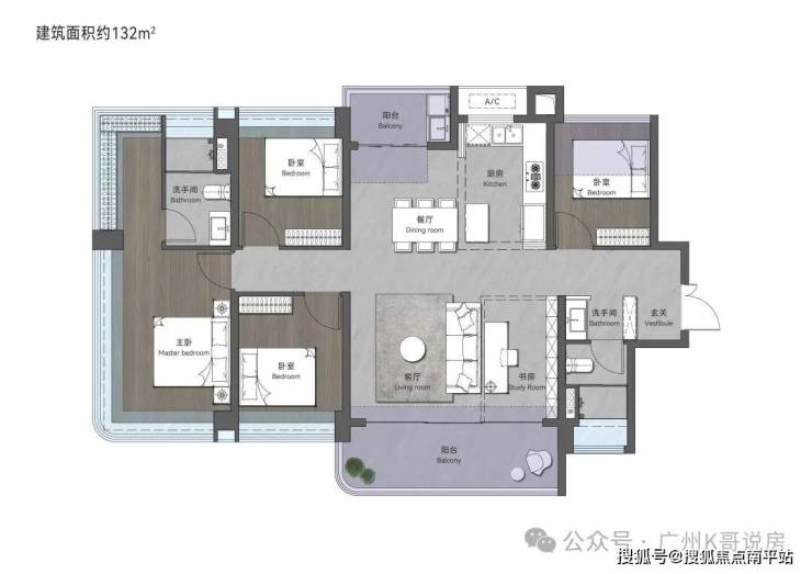 132㎡创意四房两卫,西南向,超50㎡大方厅,格局大气阔绰通透