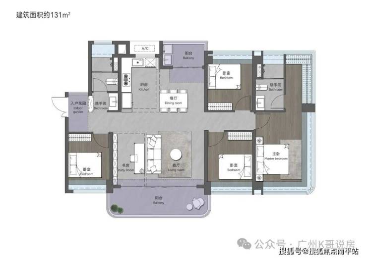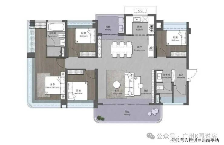 149㎡创意四房两卫,超大横厅连接环幕阳台,南北双阳台