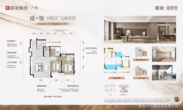 建面约98㎡户型可拓展面积约为18㎡,柳州很多旧规产品这个面积段只能做3房,但它却是真正的3+1房户型。约5.8米的景观阳台带来更充足的阳光,与其相连的横厅可分隔为客厅与书房的组合。