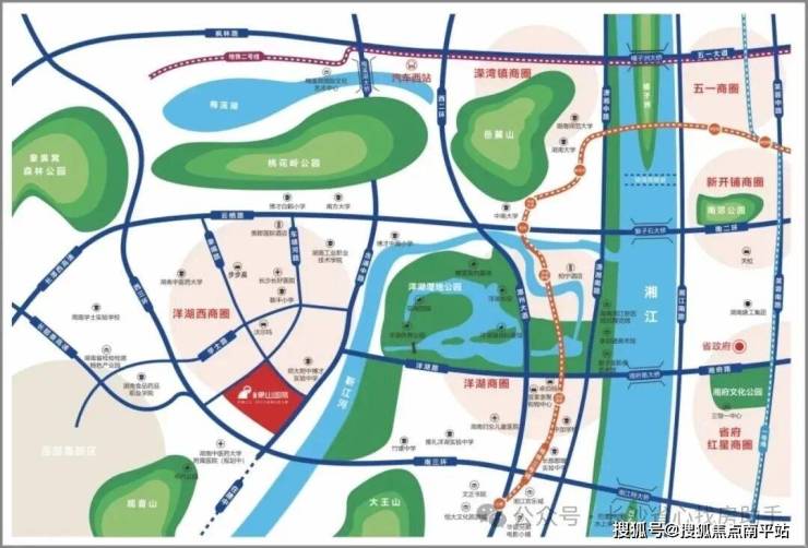 【洋湖之上 环境优越】一带:靳江河风光带(规划中)二山:周边有桃花岭、岳麓山等自然景观三园:自建约3万方中央公园、外瞰洋湖国家湿地公园(含已开放洋湖体育公园)、象鼻窝森林公园【交通便捷 畅达全城】公交线路:276路、378路、206路、235路、23路、356路、389路、38路、905路、908路等10余条地铁:规划11号、13号线过江大桥:猴子石大桥、湘府路大桥、黑石铺大桥高速交通:接驳长潭西、长韶娄、绕城高速口、麓景路南延线(含浦/梅溪湖10分钟实现无缝对接)