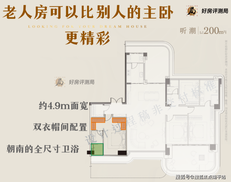 御宸天悦的200㎡产品,老人房也做出大套系统,南向约4.9米面宽相当于常规140㎡户型的客厅面宽,就连卫生间都做到了南向,可以说第二主卧难得这么“阳光”。