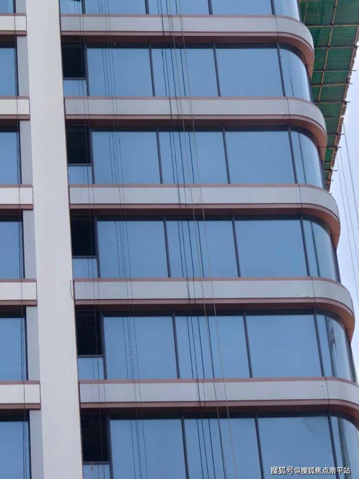 外立面采用高透光环保玻璃,营造出自然与光影的通透感,与奔涌的江河之水相呼应。采用超大尺寸落地玻璃、平开窗及饰面玻璃使楼层形成统一整体,楼层衔接处采用米白色铝板线条,通过富有韵律的线条肌理,将建筑与自然融合。