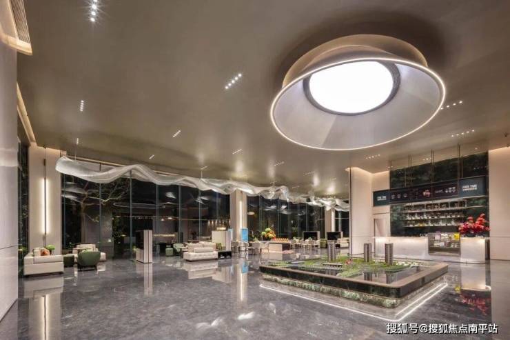 出入口电动玻璃平移门高约5.6m,雨披出挑约5.6m,对应鲁班尺(风水尺)第1格位“财”,吉应“招财进宝、家业丰隆”。整体无框的落地玻璃带来奢侈般的仪式归家大堂体验,入口的电动移门借鉴苹果体验店的做法,让归家大堂更具现代感。