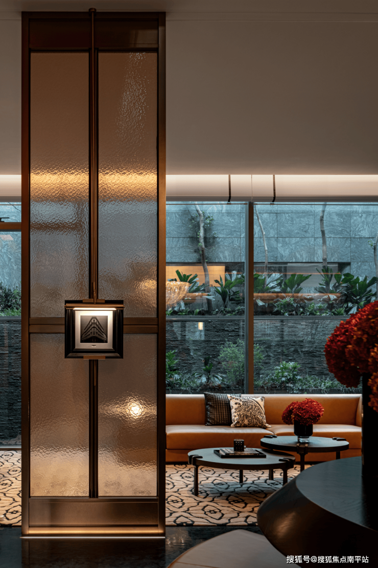 外立面采用香槟金铝板搭配270°弧形转角玻璃幕墙, 突破超高层住宅锐利直角的传统做法,且所有玻璃幕墙拐角处都做出弧度,打造少有的全景舱视野不仅赋予建筑以通透灵动的气质,更让每一道光线流畅穿梭,勾勒出无与伦比的流线美感。