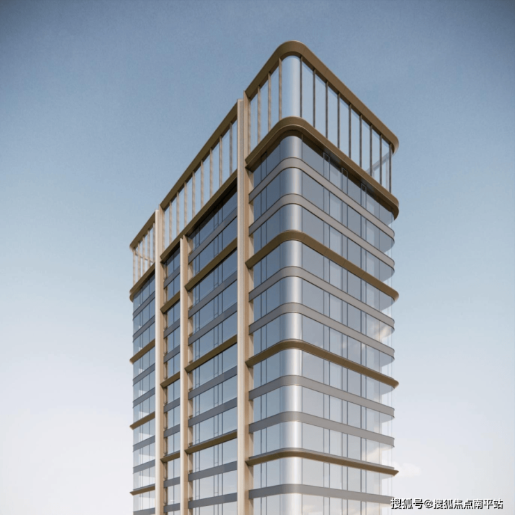 在材质上 选用玻璃慕墙,香槟金和闪银色的金属铝板 呈现品莹剔透感。弧形的墙面轮廓打破方正,仿佛也寓意着突破边界的设计暗语。
