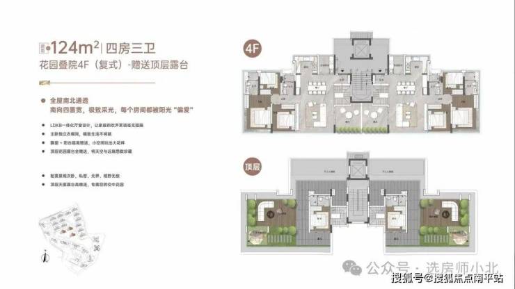 这是最接近墅级形态的户型,下层做了侧花园设计,顶层的天面露台全赠送,实现了约242%的使用率