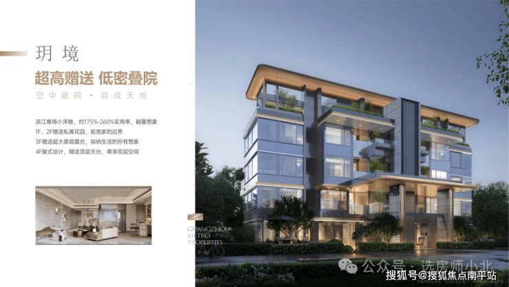 “玥境”为滨江小洋楼,主打112-124㎡低密叠院,最大亮点是超高赠送率,1F、2F户型赠送私属花园,3F赠送超大景观露台,4F复式设计,赠送顶层天台。
