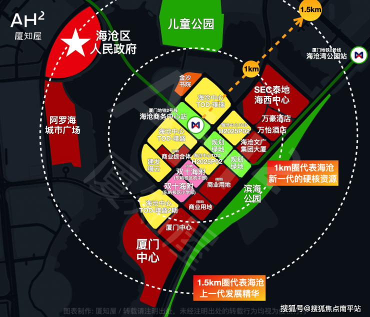第二重核心:它是TOD枢纽中心,楼下就是地铁2号线「海沧商务中心」站,交通十分便利的同时,又基于TOD开发模式,成为了东屿核心配套的集大成者——配套近乎以「海沧商务中心」站为圆心而坐落,均衡度非常高。