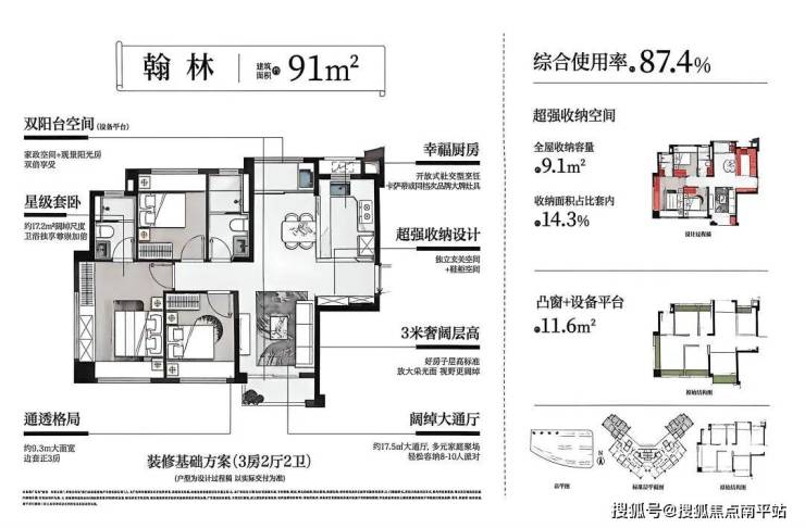 91㎡户型南北双阳台设计,主卧套房配独立卫浴;