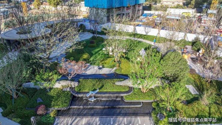 保利·和颂,引用传统园林的叠山理水手法,以古法工艺和现代取材融合,用流水、密林、花岗岩、原石、草木等场景相互渗透,演绎出了一幅只此青绿的山水意境。