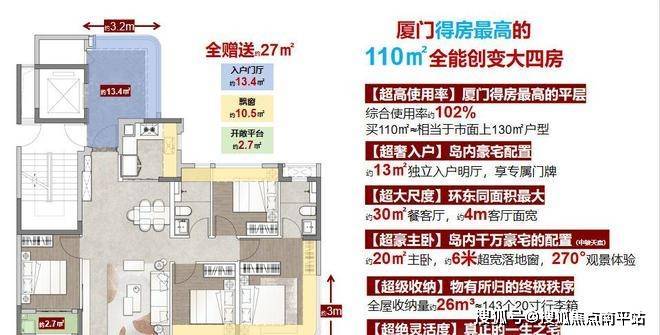 全厦门得房率最高的新房110㎡,四房两厅两卫,综合使用率102%。