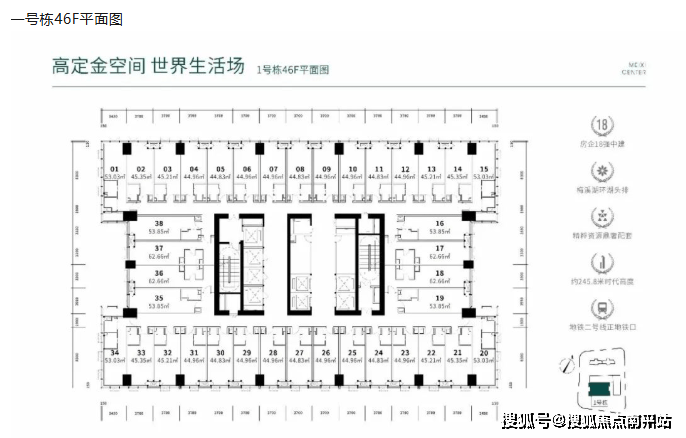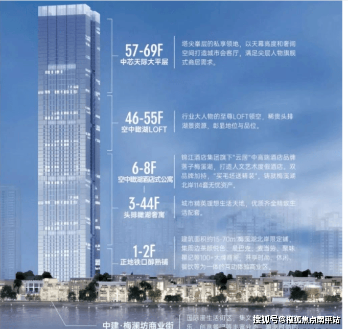 约245.8米高的摩天大楼,梅溪湖北岸最高标志性建筑。楼体采用全玻璃幕墙结构,铸就奢阔景观视野。结合精奢平层、百变LOFT、顶级大平层等多业态发展,引领区域经济红利。