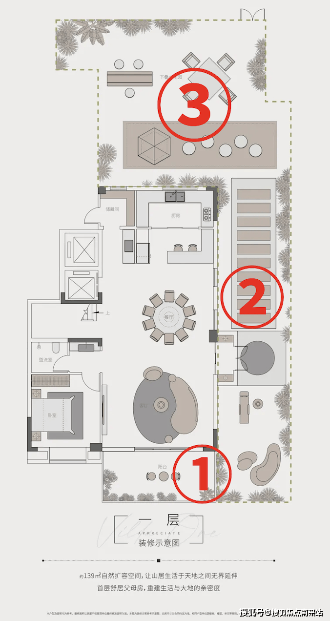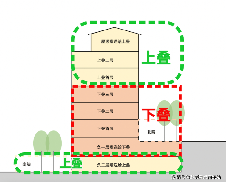 下叠:地上1-3层+全明负一层+北院,实得4层空间;