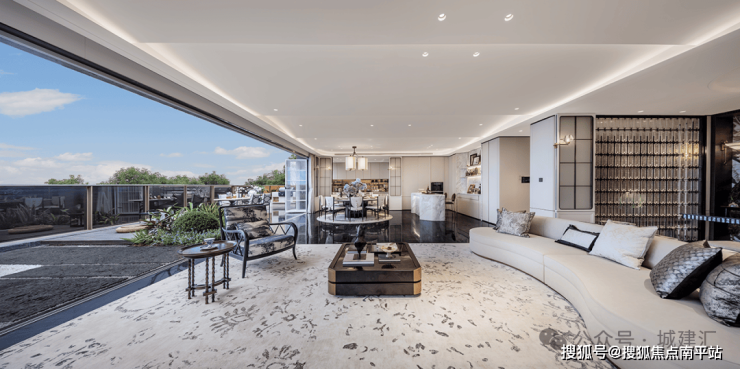 其“无界尊荣”以最高约3.3米奢适层高+南向最大约28米面宽,纵深铺陈空间。无墙体社交厅设计,以全景视野+开阔社交区二合一,采光面拉满的同时,让家庭互动、圈层待客都足够舒展。