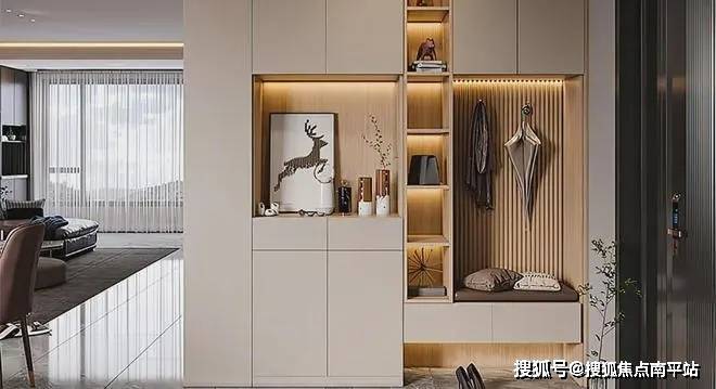 北侧入户拥有完整的独立玄关,并配备了整墙收纳柜,功能性和私密性兼备。相比之下,目前市场中多数下叠均为南入,穿过院子从客厅入户,缺少独立玄关换鞋储物。