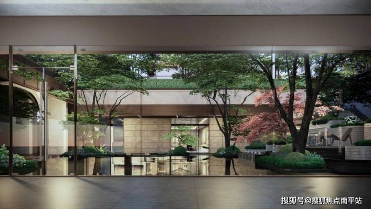 事实上,被整个大堂和会所包裹的下沉庭院,一进门厅就能透过一整面玻璃幕墙,毫无遮挡地闯入你的视野。