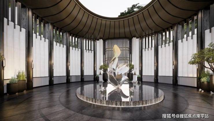 中央的圆形镜面水台,象征着圆满与和谐。其上的花朵雕塑,唯美浪漫,展现高贵与新生之美。