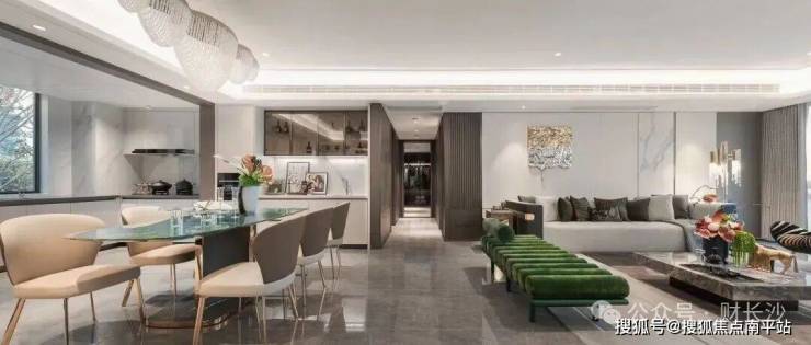 ⭐层高约5.5米车库入户大堂,质感空间升级归家仪式体验;车库采用耐磨型环氧地坪漆,在顶部规格打造上,对标长沙商业豪宅大平层,使用大面积铝板透光天花、异形立体铝拉网天花等豪华配置。