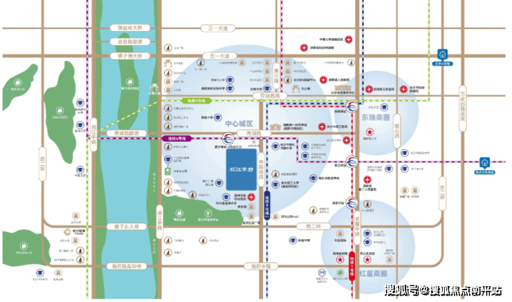 南郊公园、火车头公园、望江公园环伺,湘江风光带直线距离仅约800米,尽享自然风光;市中心医院、湖南中医药大学第一附属医院等5大三甲医院环伺,为健康保驾护航。