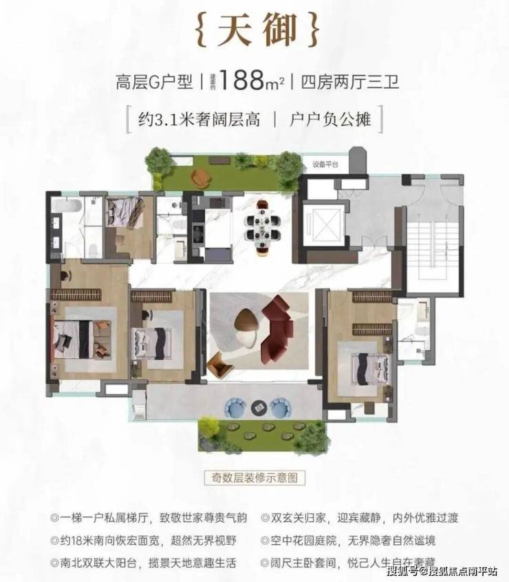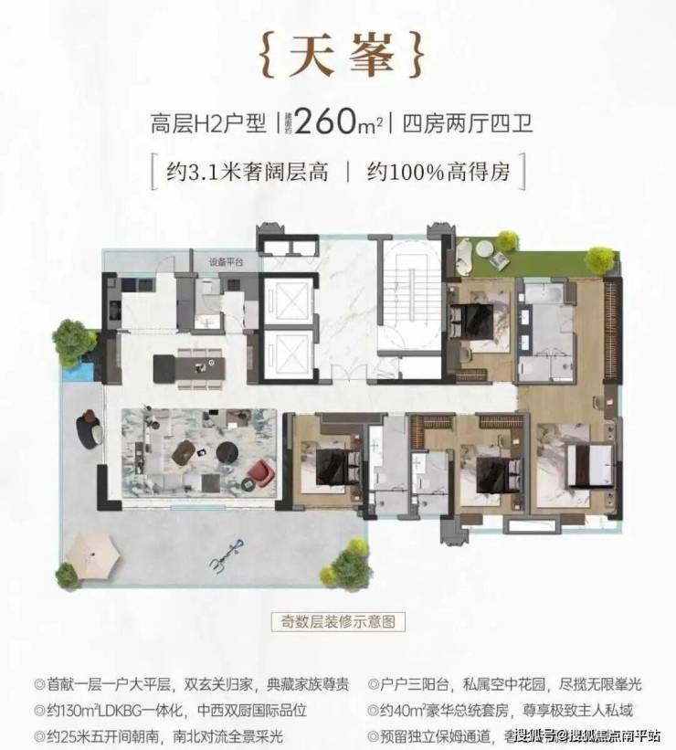 1. 大平层:一层一户设计,建面约188–260㎡,最大南向面宽约25.6m,层高约3.1m,电梯厅私享;