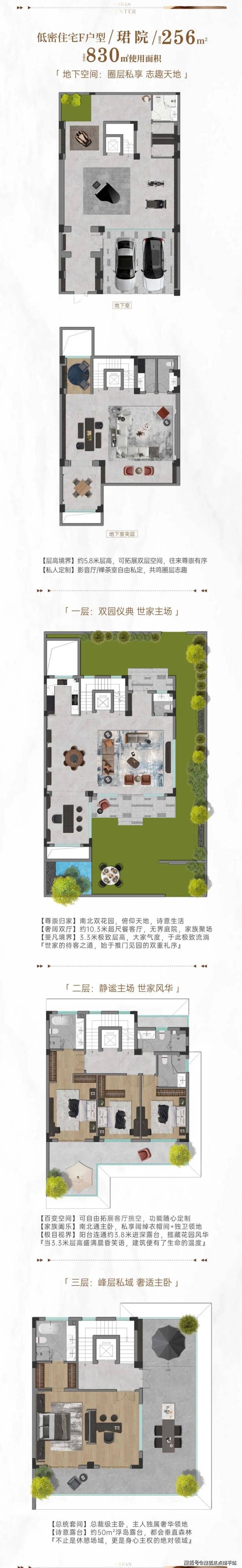 2. 院墅:建面约177–256㎡,高赠送,有天有地的院落体验;