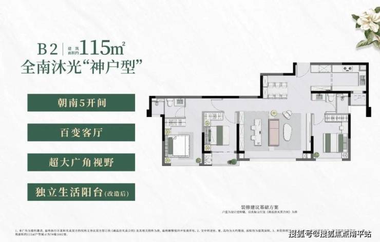 115㎡户型突破传统功能限制, 以约17.5米南向大面宽实现五开间朝南,这样的尺度表现甚至超越部分140㎡+产品。 结合6米客厅面宽,在有限面积内创造开阔感; 独立餐厅与U型厨房形成高效生活三角区,功能完整性罕见匹配。