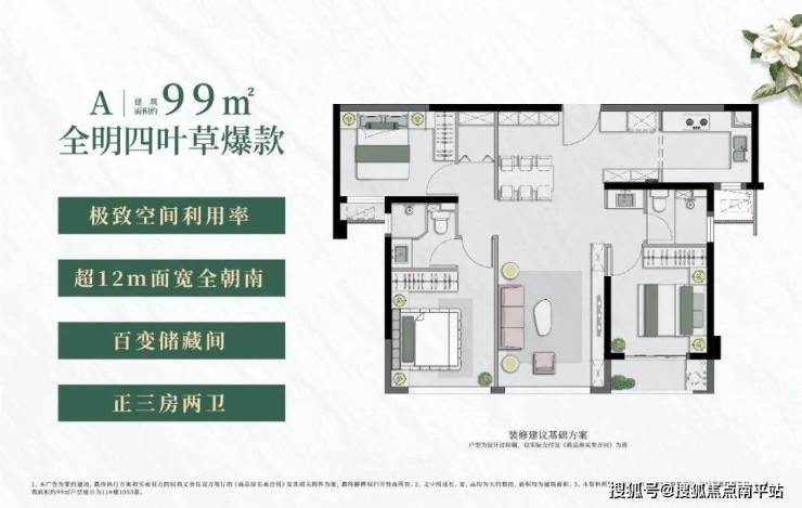 建面约99㎡户型则重新定义了紧凑型住宅的价值标准。 作为泉州市场稀缺的百平以下产品,以约12.2米南向大面宽,远超传统99㎡约10米的标准面宽,实现正三房+客厅全南向布局,配合4面采光设计,使整体采光效率较传统提升一倍以上。