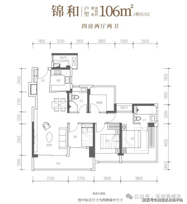 建面约106㎡宽幕人生,以IMAX光幕揽景,以LDKB方厅聚情,更以转角视野与匠心细节,奢享从容生活。• 锦瑟·建面约107㎡4房2厅2卫:双龙抱珠,一线园景,奢阔雅居