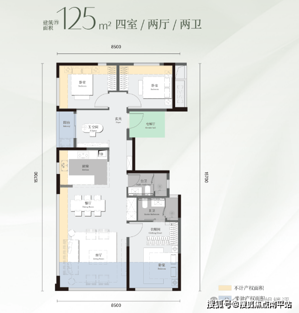 另外一个建面约125平的户型是270°采光的户型,分布在楼栋两侧。这个户型跟一期同户型基本是一样的,一进门是个多变空间。