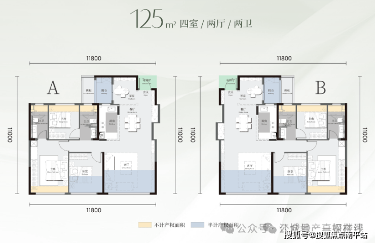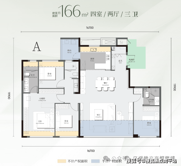 最大户型是建面约166平四房两厅三卫,这个户型也有两种结构。