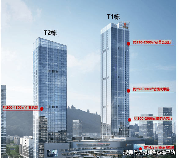 ✨ 分区规划:T1栋约236米/54层,其中8-19层约300-2000㎡商务会客厅、21-45层 为295-388㎡总裁大平层、47-54层为约530-2000㎡私董会客厅;T2栋约176米/40层,规划约约200-1300㎡企业总部。
