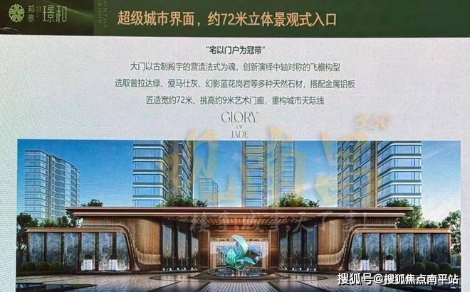 大门正对丰和北大道,宽约72米、挑高约9米艺术门廊。