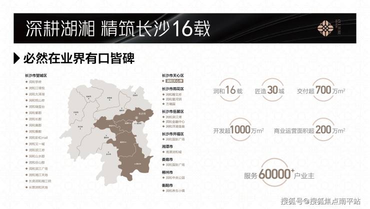 累计开发面积约1000万方,建筑施工面积约1000万方,商业招商运营面积约200万方,服务业主约60000户。2016-2023年,润和城销售势头强劲,销售面积连续多年荣膺位列长沙房企销售排名前列。