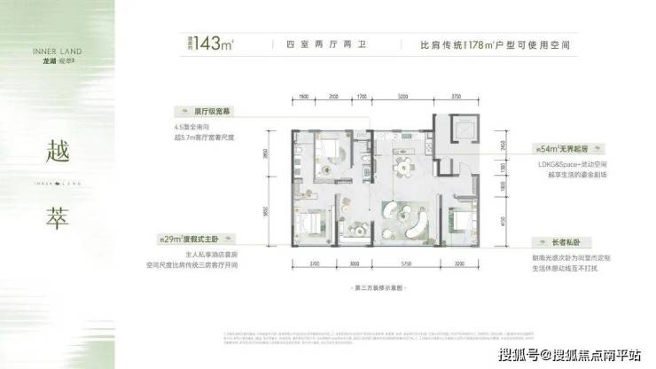 建面约143㎡全生命周期零公摊四房,通过LDKG一体化巨厅与开放式X休闲空间设计,实现比肩传统建面约178㎡户型的可使用面积。4.5面全南向布局、超5.7m客厅宽奢尺度、约54㎡无界起居空间,搭配约29㎡度假式主卧套房,既满足三口之家的舒适需求,也适配多代同堂的居住场景,生活休憩动线互不打扰。